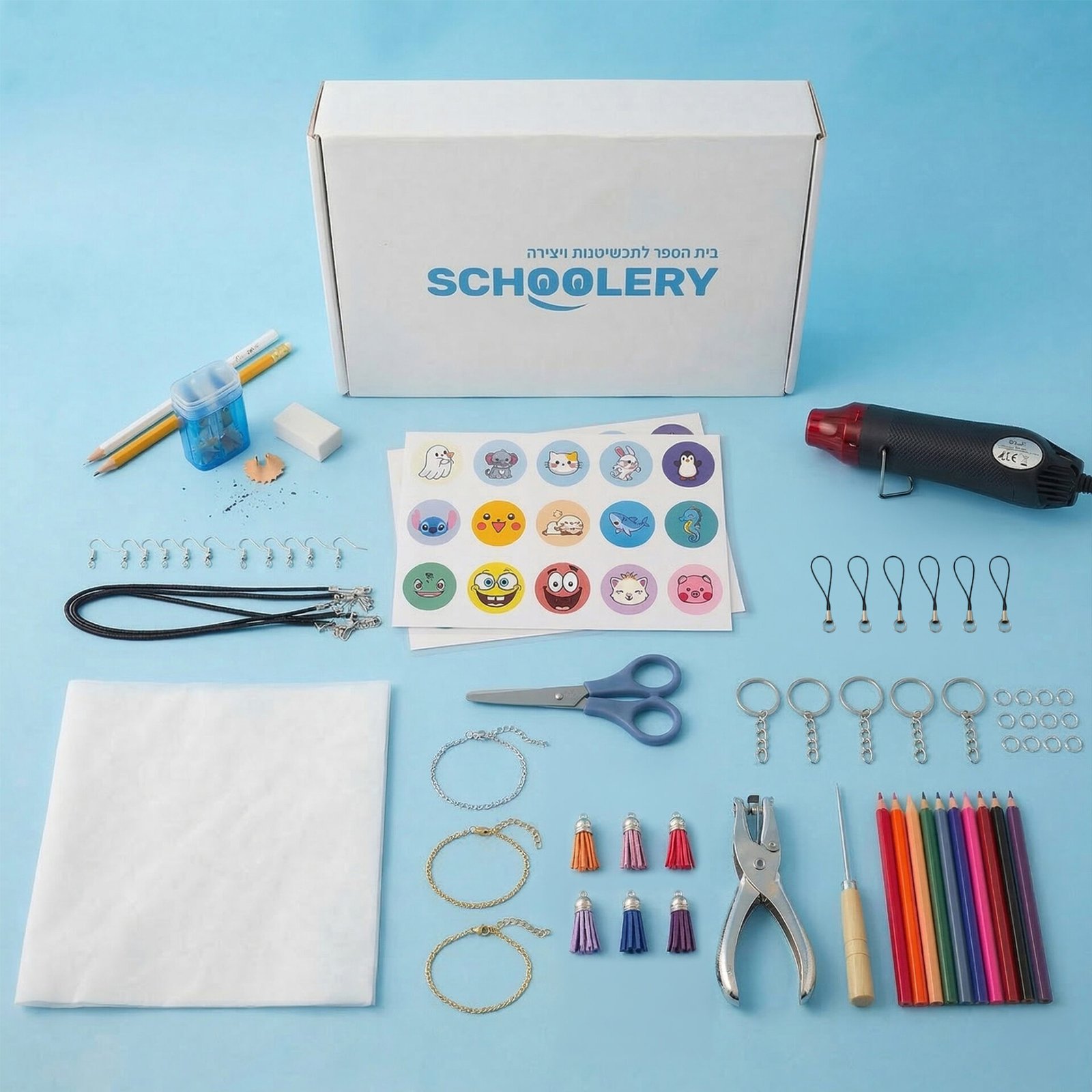 סט כלי עבודה מקצועי – כולל מחורר מקצועי ליצירת חורים מדויקים, מספריים איכותיות לגזירה קלה ומחט להחזקת התליון בזמן החימום.