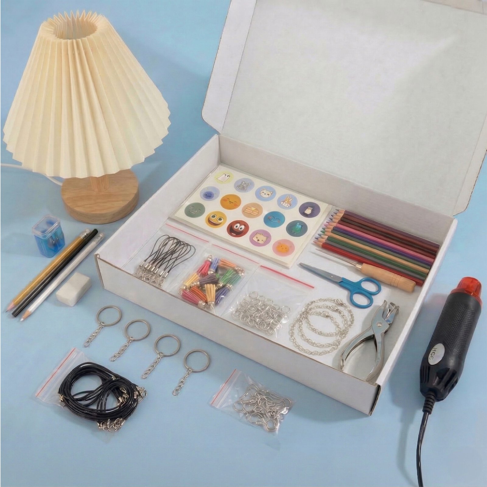 ערכת חיבורים ואביזרים (זהב וכסף) – 100 לולאות, 8 שרשראות, 6 צמידי צ'ארמס, 16 מתלי עגילים (8 זוגות), 5 מחזיקי מפתחות, 6 גדילי זמש צבעוניים ו-6 רצועות לחיבור לנייד – כל האביזרים שתצטרכו כדי להכין עשרות תכשיטים ואקססוריז אישיים.