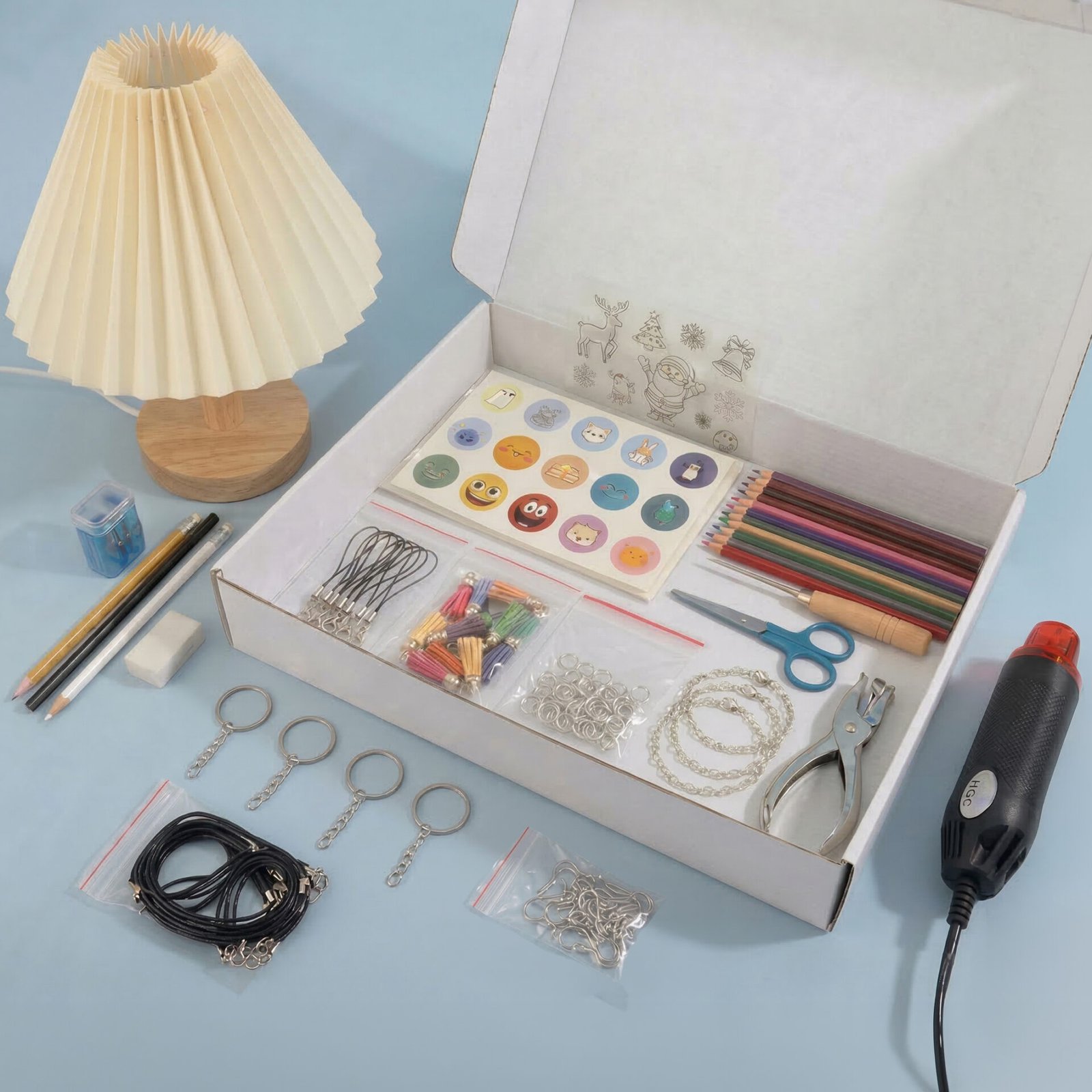 ערכת חיבורים ואביזרים (זהב וכסף) – 100 לולאות, 8 שרשראות, 6 צמידי צ'ארמס, 16 מתלי עגילים (8 זוגות), 5 מחזיקי מפתחות, 6 גדילי זמש צבעוניים ו-6 רצועות לחיבור לנייד – כל האביזרים שתצטרכו כדי להכין עשרות תכשיטים ואקססוריז אישיים.