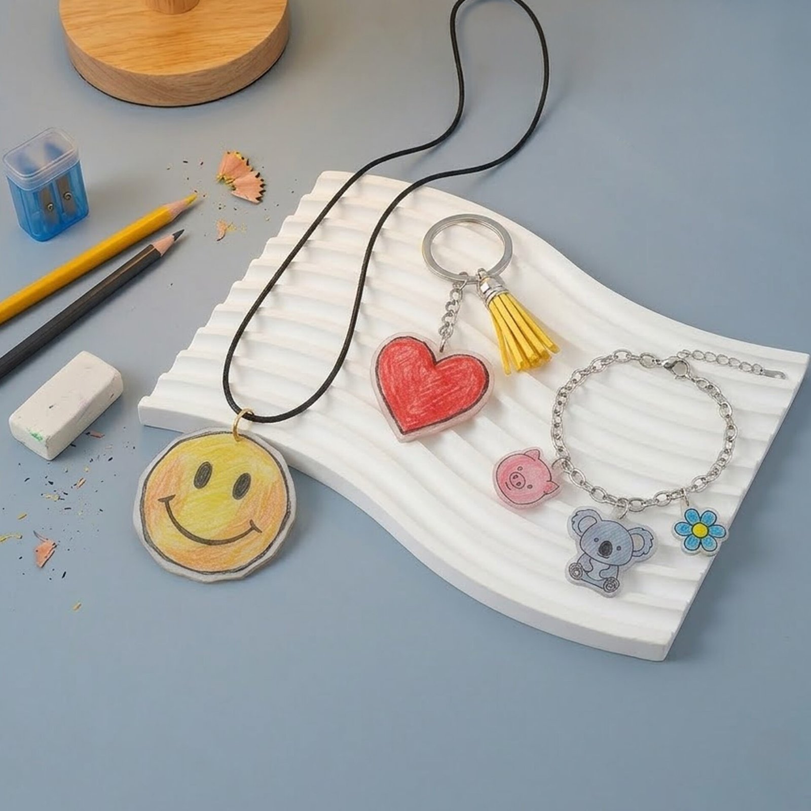 אינסוף אפשרויות עיצוב – משילוב צבעים ייחודיים ועד שימוש בשבלונות ובאיורים המוכנים, הערכה מאפשרת לעצב עגילים, מחזיקי מפתחות, תליונים שרשראות ועוד בהתאמה אישית מלאה.