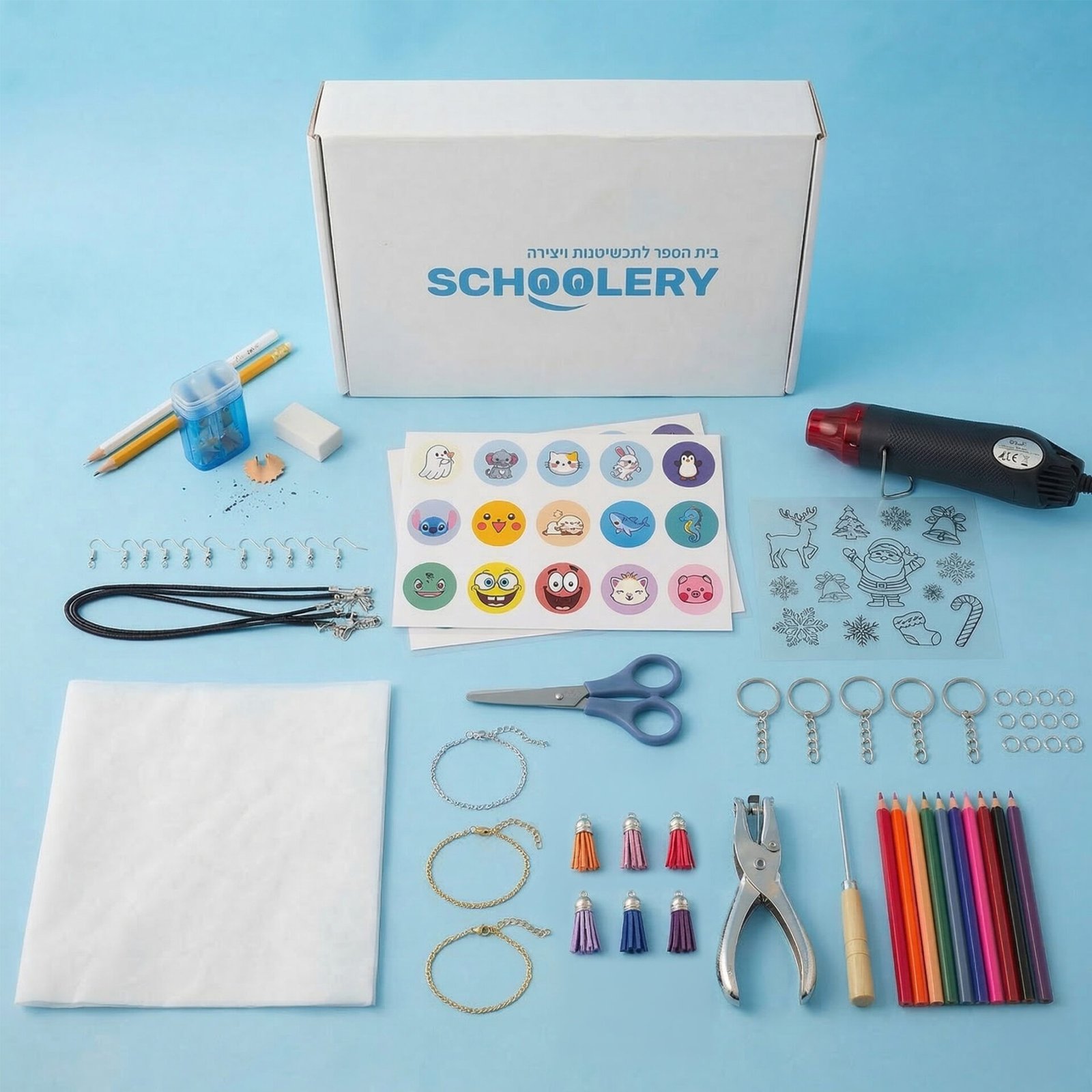 סט כלי עבודה מקצועי – כולל מחורר מקצועי ליצירת חורים מדויקים, מספריים איכותיות לגזירה קלה ומחט להחזקת התליון בזמן החימום.